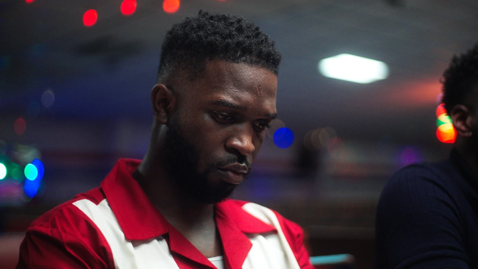 A young man with short curly hair and a beard, wearing a red and white shirt, looking down thoughtfully, in a dimly lit setting with colorful blurred lights in the background.
