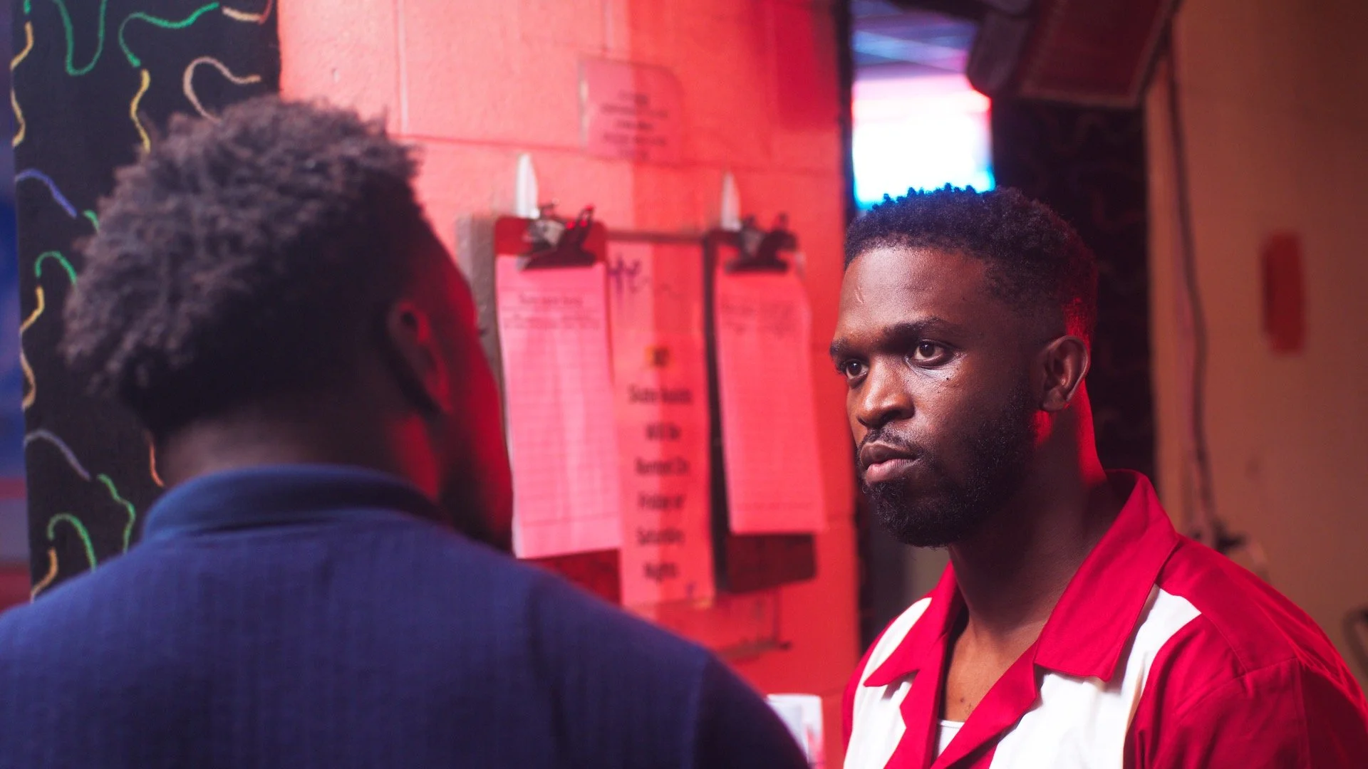 Two men facing each other, the man on the right wearing a red and white shirt, inside a dimly lit establishment with neon lighting and menu boards in the background.