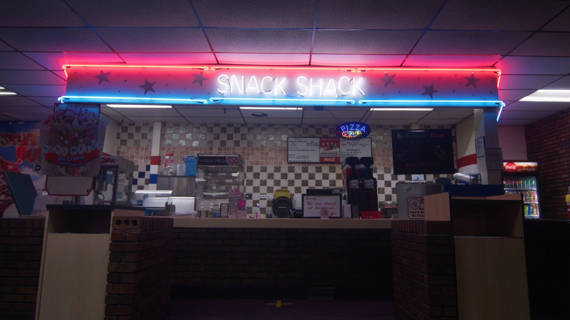 Inside a snack shack with illuminated neon sign reading "Snack Shack," counter area with menu, pizza signs, refrigerator with drinks, and a chalkboard for reservations.