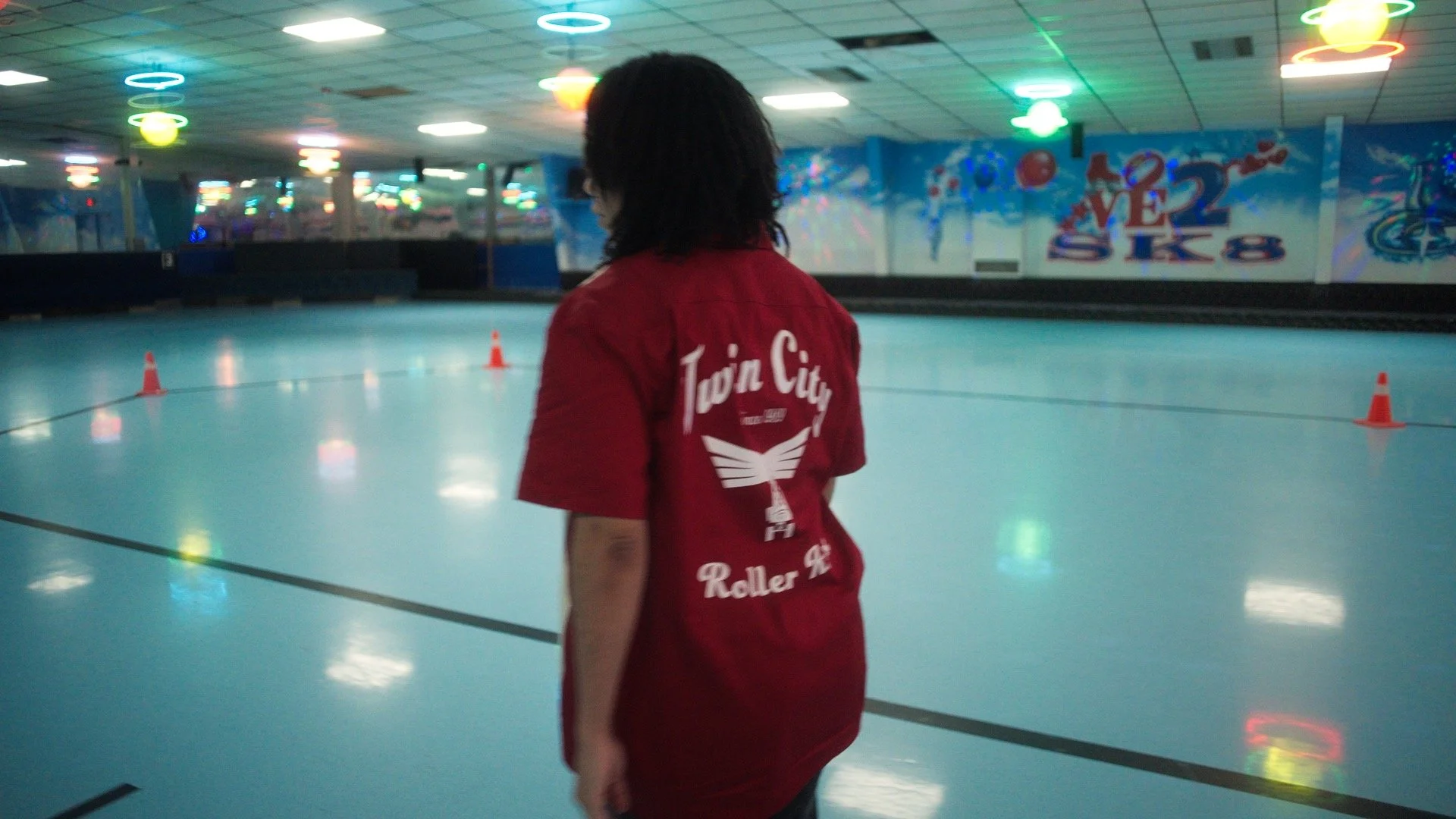 A person with dark, shoulder-length hair wearing a red, short-sleeved shirt with 'Twin City Roller' on the back, standing near an empty roller-skating rink with colorful ceiling lights and murals in the background.